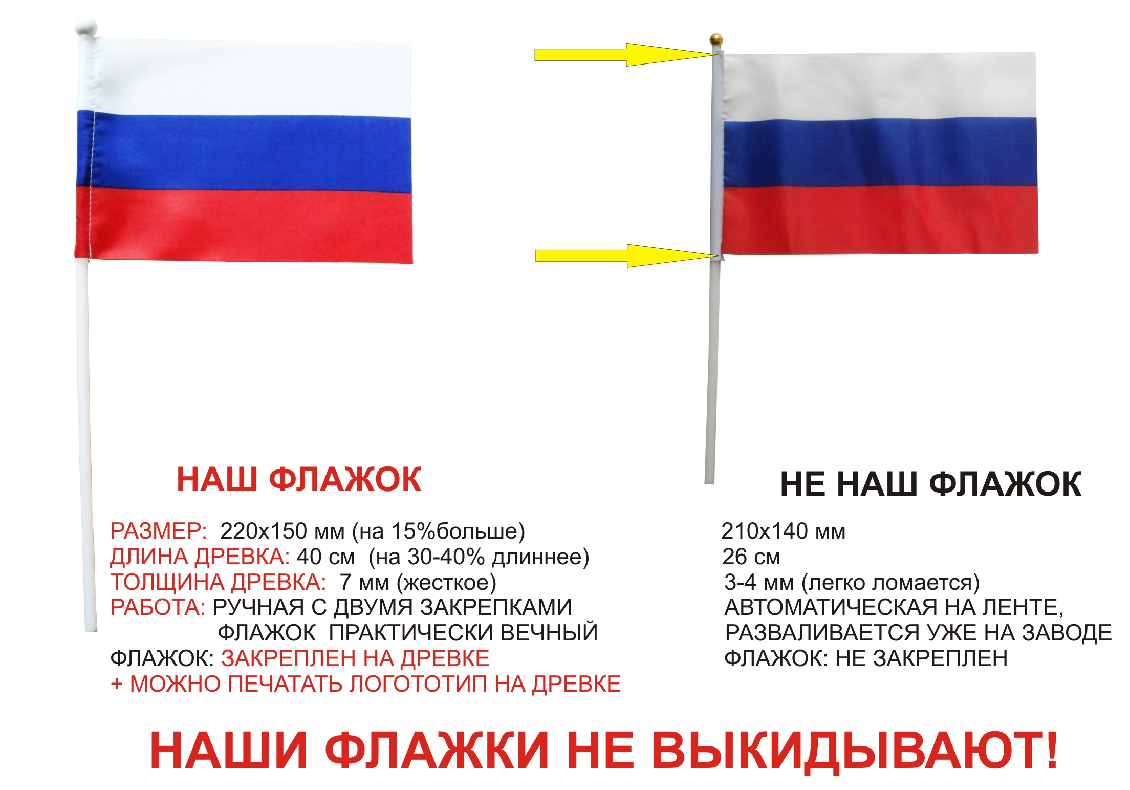 ЦЕНА со склада – от 17 рублей, с НДС. (Смотрите прайс-лист и информацию о крупных заказах.) Описание: Размер – 22,5х15 см, ткань - полиэстер (полиэфирный шелк), двухсторонний, полноцветная сублимационная печать, плотность красок на обратной стороне – 92% от лицевой, плотность ткани - 55 г/м2 , ручная прошивка с двумя фиксирующими стежками, карман под древко – 12 мм. Поставляется с древком-флагштоком. Древко: материал – пластик (полипропилен), длина – 40 см, толщина – 7 мм, вес – 5,4 г, с креплением – силиконовым кольцом и шариком-навершием, диаметром 15 мм. КОЛИЧЕСТВО / ЦЕНА С НДС: 100 / 19,20 ₽/шт 200 / 19,00 ₽/шт 300 / 18,80 ₽/шт 500 / 18,60 ₽/шт 1 000 / 18,20 ₽/шт 2 000 / 17,60 ₽/шт 3 000 / 17,40 ₽/шт 6 000 / 17,00 ₽/шт 12 000 / 16,80 ₽/шт